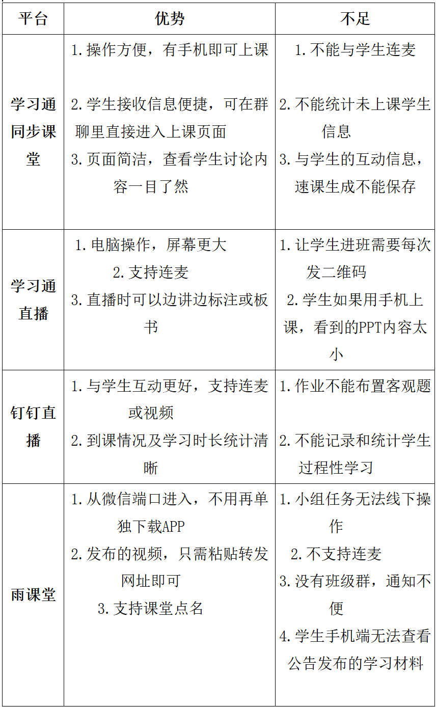 据统计,线上教学平台的选择情况是:5位教师使用学习通同步课堂,3位教师使用学习通直播,2位教师使用钉钉直播,1位教师使用雨课堂。根据教师分享,总结了各平台的优劣: